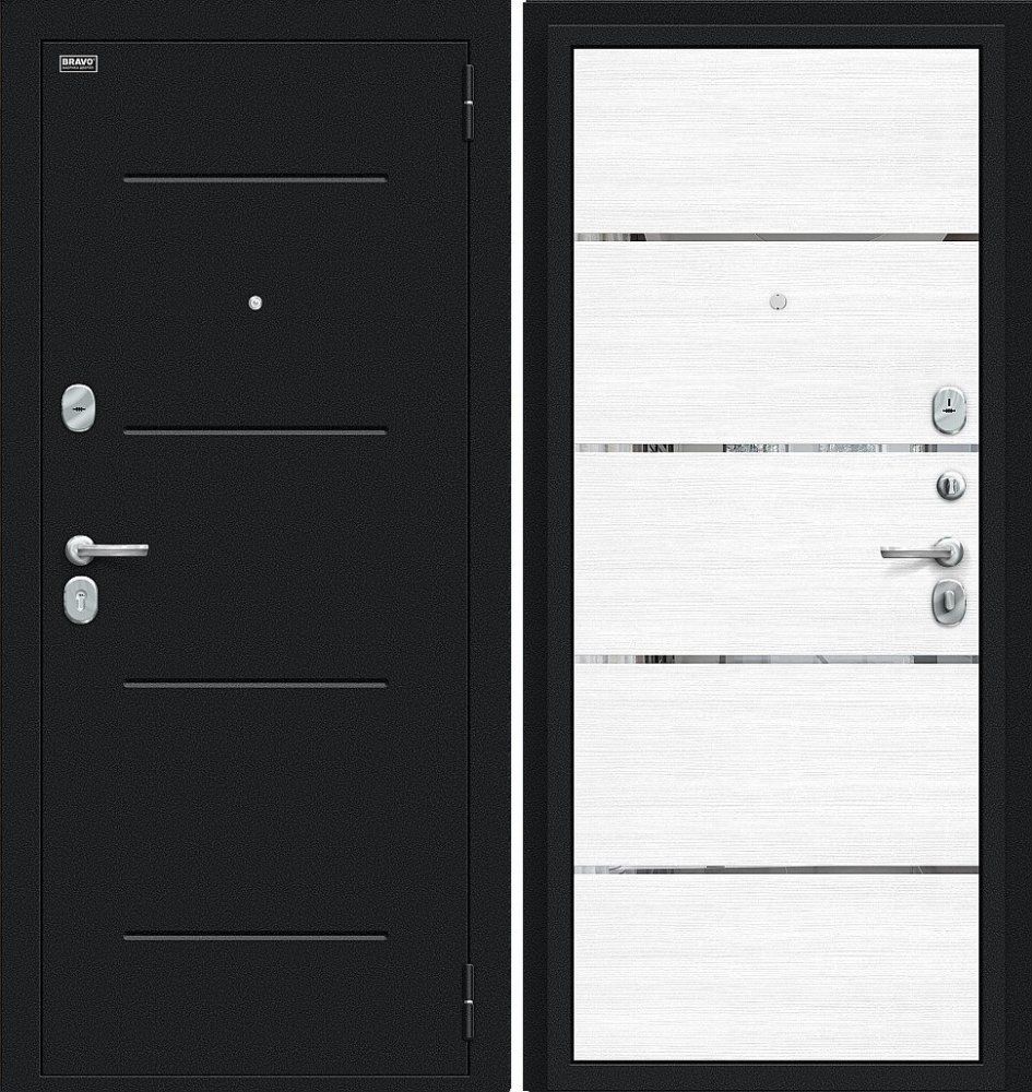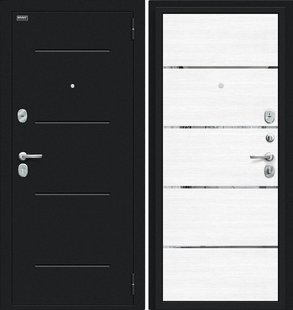 Надежная входная Дверь Браво Лайн Букле черное/Snow Melinga премиум класса по цене 30 141 руб. Большая толщина стали защитит от проникновения в ваш дом, квартиру или коттедж. Используется очень качественная фурнитура: замки, цилиндры, ручки, защелки. Покрытие и отделка двери изготовлено под внимательным контролем производителя. Дверь имеет долгий срок службы и гарантию.