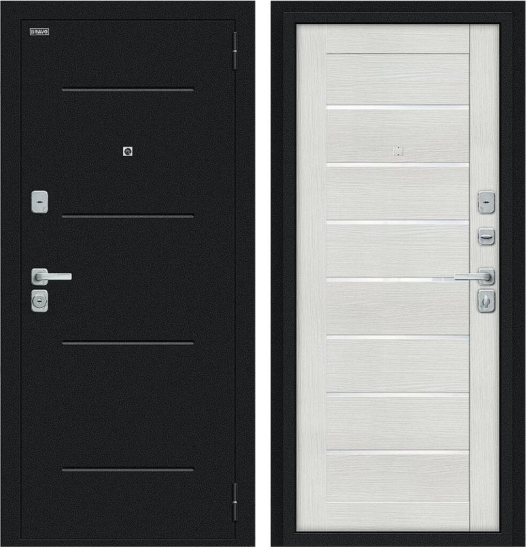 Надежная входная Дверь Браво Техно/BChrome Букле черное/Bianco Melinga премиум класса по цене 34 471 руб. Большая толщина стали защитит от проникновения в ваш дом, квартиру или коттедж. Используется очень качественная фурнитура: замки, цилиндры, ручки, защелки. Покрытие и отделка двери изготовлено под внимательным контролем производителя. Дверь имеет долгий срок службы и гарантию.